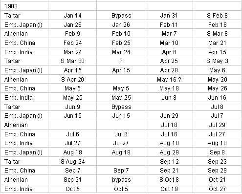 Footnotes(SF) in 1888 indicates the a ship had visited San Francisco before returning to Vancouver.Schedules say passengers must board Athenian and Tartar in Vancouver - starting about August 1904. In other words, there would be no call at Victoria. * Tartar was quarantined and fumigated at William Head for smallpox on April 3, 1906. † Abyssinia scraped the water pipe under the First Narrows in Vancouver, and was checked at Esquimalt. + Tartar Oct 17, 1907 hit by Charmer in fog; 2 large holes in bow. To drydock at Esquimalt. Last trip for Tartar. Departed Victoria November 26, 1907. # Glenfarg hit a reef in Vancouver's First Narrows on December 6, 1908; went to drydock at Esquimalt. Repairs completed early February. In June 1914, Manila, Philippine Islands was added as a port of call on westbound voyages of the Empress of Russia and the Empress of Asia. < (followed by date) means before = (followed by date) means on or before Esq means Esquimalt