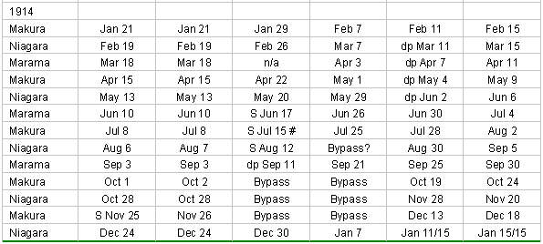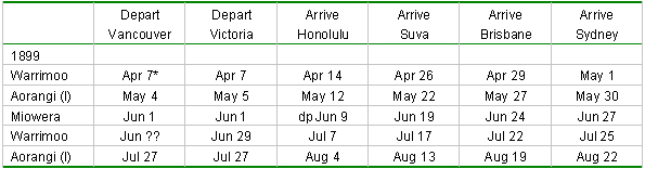 * Warrimoo departed Vancouver at 1 a.m. on April 7. Miowera departed Vancouver at 2 p.m. on June 1; was to sail at 8 p.m. from Victoria Outer Wharf.