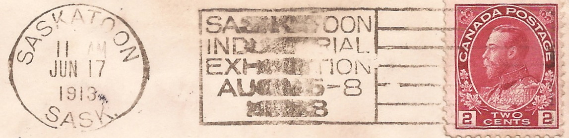 | MAR 14 | 9 PM | 2¢ letter to Balgonie SK | | | APR 3 | 2 PM | 2¢ letter to Chicago, Bowman Bros. corner | | | MAR 24 | 4:30 PM | 2¢ letter to Springfield MA, Pittsburgh Steel corner | | | APR 20 | 9 PM | 1¢ postcard to Edgewood BC | | | APR 29 | 9 PM | 2¢ letter to Toronto | | | MAY 18 | 6 M | 1¢ drop letter | | | MAY 20 | 5:30 PM | 2¢ letter to Toronto | | | JUN 3 | 7 PM | 3¢ letter from Regina | | | JUN 15 | 11 PM | postcard to UK | | | JUN 19 | 9 PM | 2¢ postcard to France | | | JUN 22 | 1:30 PM | 1¢ postcard to Regina | | | JUL 30 | 10 AM | 1¢ postcard letter to Sioux City IA | | | JUL 31 | 7 PM | 2x4 | | | AUG 8 | 11 PM | 2¢ letter to St. Thomas | |
