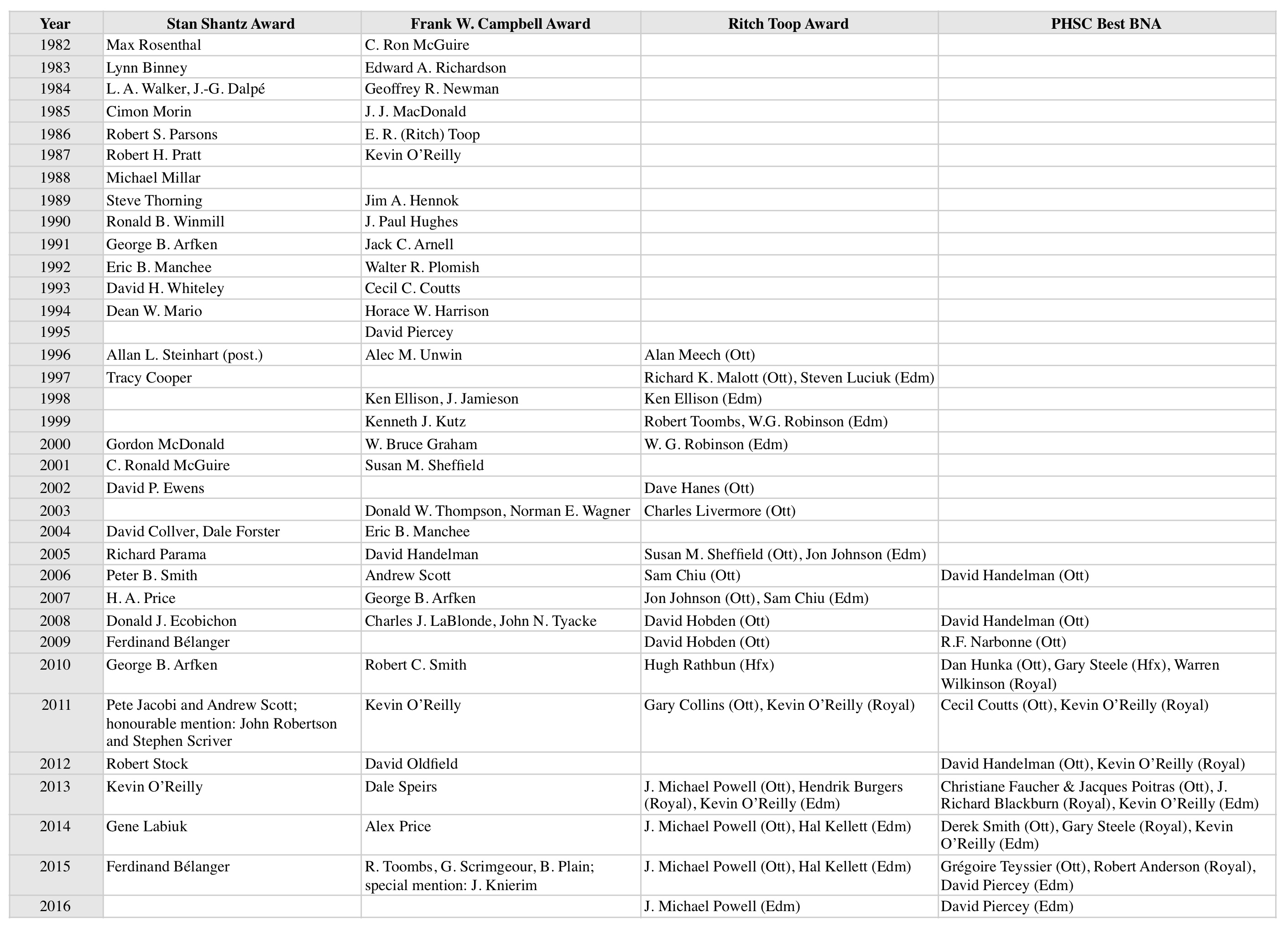Since 1982, the Society has offered two annual awards to writers on postal history: the Stan Shantz Award is presented annually to the author of the article deemed most worthy in the PHSC Journal, and the Frank W. Campbell Award for major contributions to the study of BNA postal history in other publications.